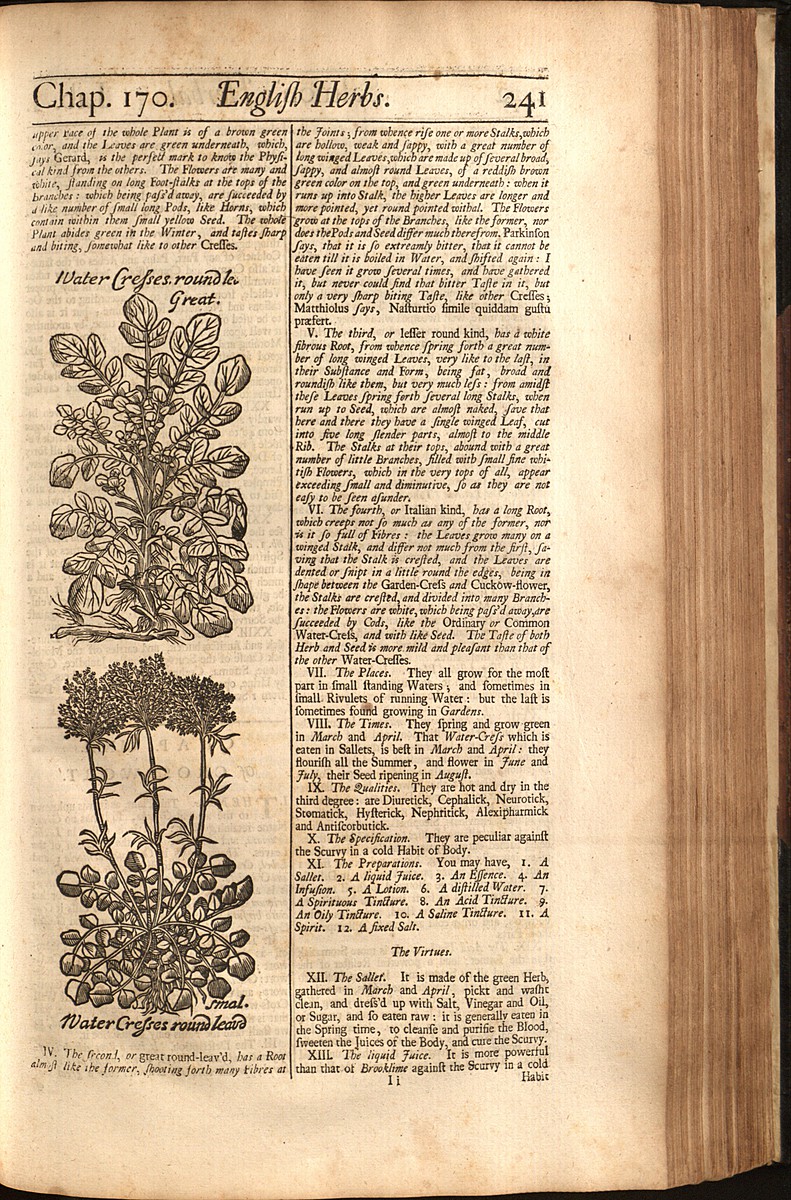 Gallery: Salmon 1710 ProofreadThis is a page to be proofread from Salmon's Botanologia, 1710. See Chap. 170. Of Cress Water. Book Navigation ‹ 00276 up 00278 ›